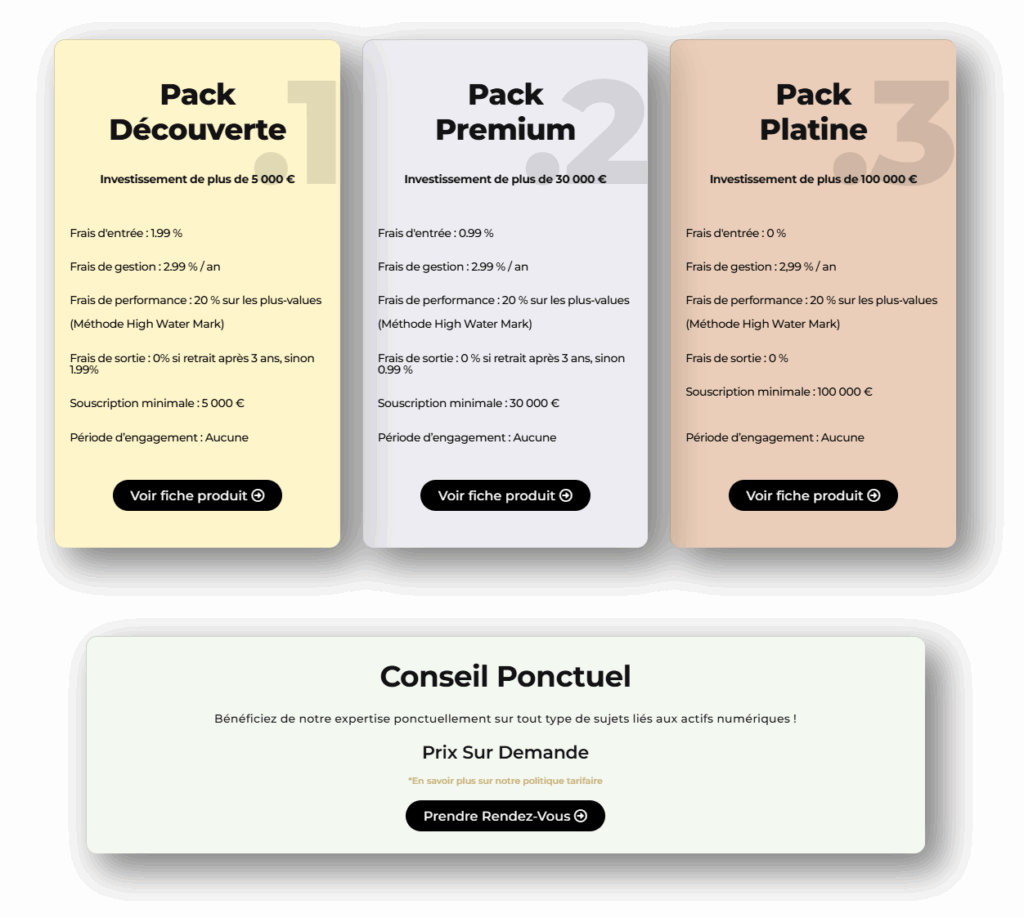 Chez Crypto Assets Management, nous proposons une gestion sous mandat de portefeuilles d’actifs numériques, personnalisée selon votre profil. Notre stratégie repose sur l’analyse et la gestion des cycles de Bitcoin (historiquement de 4 ans), privilégiant les investissements à long terme, des arbitrages mensuels, et un accent particulier sur la tokenomics.