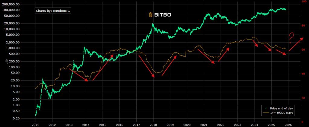 Prix du Bitcoin en vert en log & 1 year HODL wave (Source : Glassnode).
